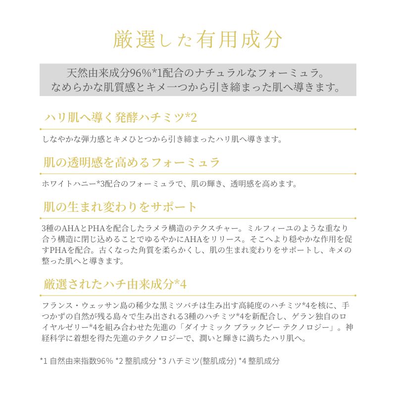 ホワイトハニー*4配合のフォーミュラで、肌の輝き、透明感を高めます。