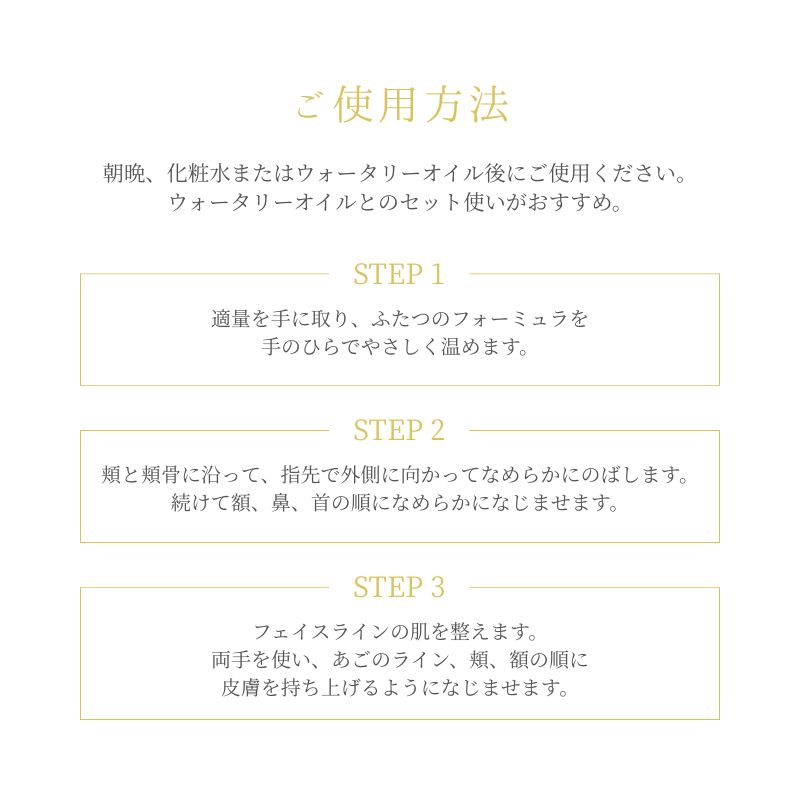 朝晩、化粧水またはウォータリーオイル後にご使用ください。