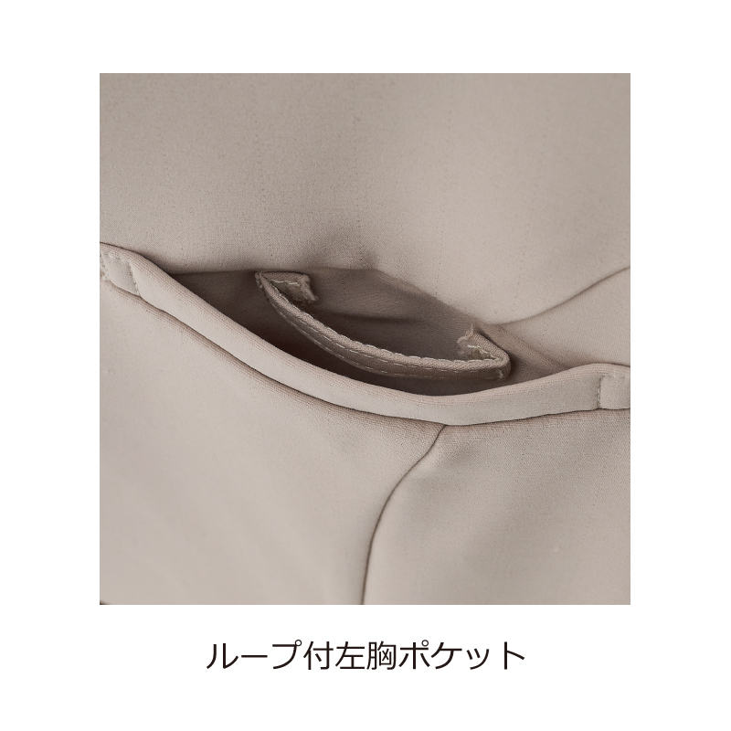 後ファスナー、左胸ポケット(内側ループ付)、両脇ポケット、スカーフ取り外し可、左袖ロゴ刺しゅう入り【ストレッチ】【吸水速乾】【接触冷感】【透け防止】【帯電防止】【防汚】【UVカット】