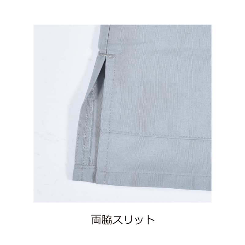 右肩スナップボタン、 PHS落下防止タブ付き胸箱ポケット、左胸ポケット、右脇ループ、両脇二重ポケット、両脇スリット