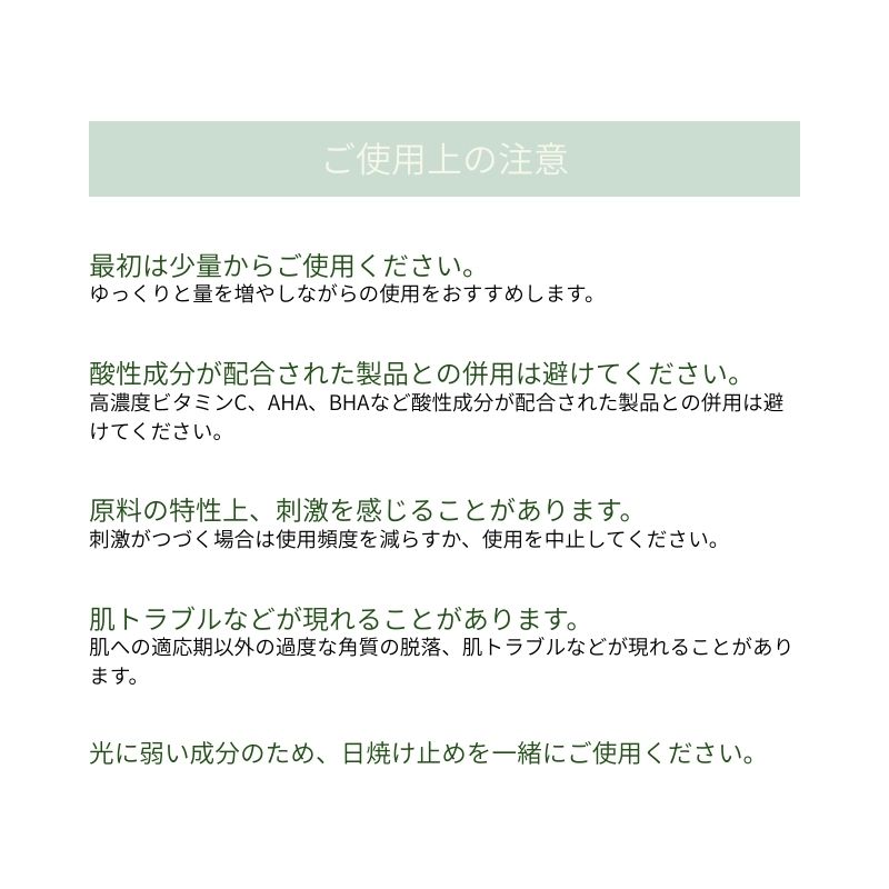 2.高濃度ビタミンC、AHA、BHAなど酸性成分が配合された製品との併用は避けてください。