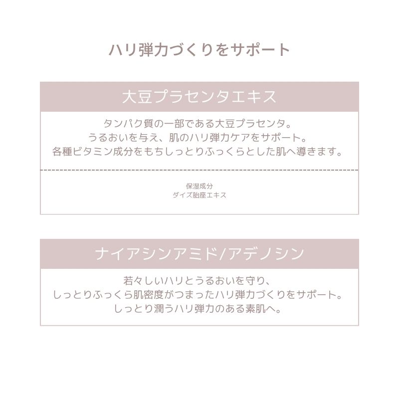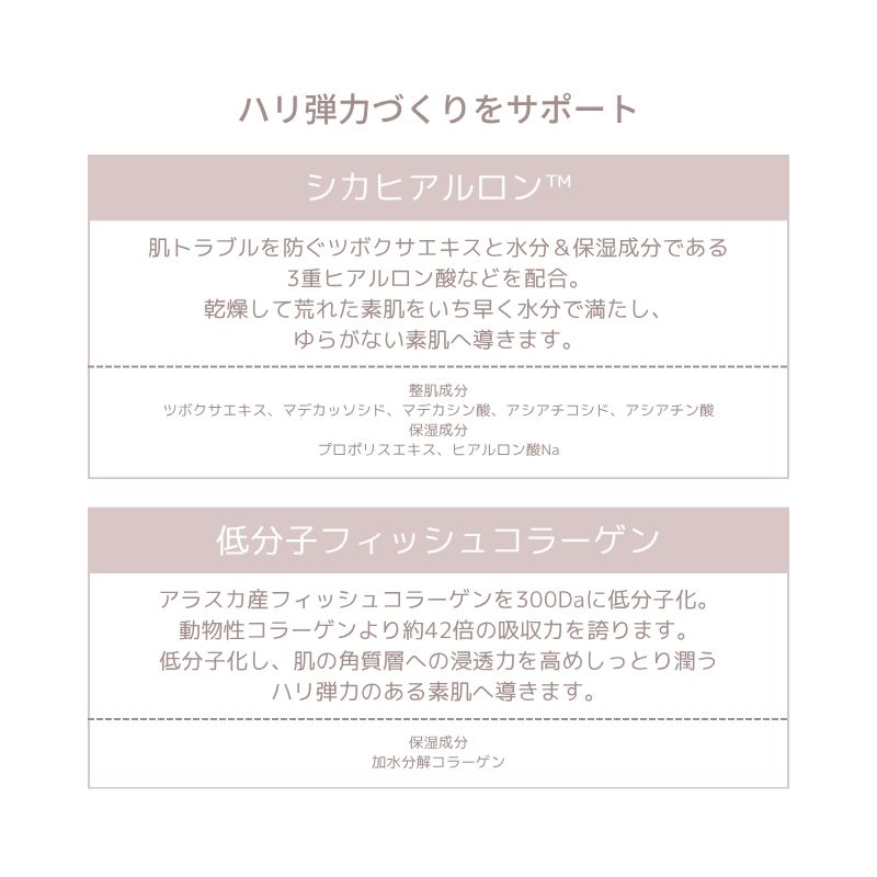 300Da低分子フィッシュコラーゲン*1に加え、ナイアシンアミド*2やアデノシン*2を配合。若々しいハリとうるおいを守りしっとりふっくら肌密度がつまったハリ弾力づくりをサポート!