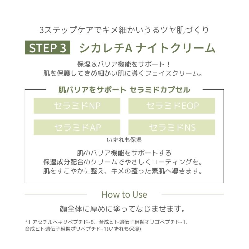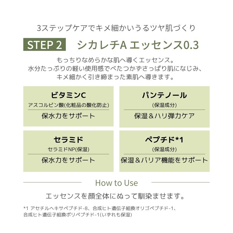 成分 (シカレチA ファーストマスク)水、グリセリン、プロパンジオール、ナイアシンアミド、1,2-ヘキサンジオール、シア脂、ポリアクリル酸Na、水添レシチン、水添ポリデセン、ステアリン酸ポリグリセリル-10、カプリリルグリコール、アデノシン、エチルヘキシルグリセリン、ヒドロキシアセトフェノン、EDTA-2Na、BG、トリデセス-6、メリアアザジラクタ葉エキス、(C11-13)イソパラフィン、ヒアルロン酸Na、ツボクサエキス、メリアアザジラクタ花エキス、バクチオール、ジメチルイソソルバイド、加水分解エラスチン、レチノイン酸ヒドロキシピナコロン、コラーゲンエキス、レシチン、ポリソルベート20、レチノール、アシアチコシド、アシアチン酸、マデカッソシド、マデカシン酸、プロポリスエキス、香料 (シカレチA エッセンス0.3)水、BG、水添ポリ(C6-14オレフィン)、ジメチルイソソルバイド、1,2-ヘキサンジオール、ナイアシンアミド、エチルヘキサン酸セチル、テトラエチルヘキサン酸ペンタエリスリチル、ステアリン酸グリセリル、ジステアリン酸ポリグリセリル-3メチルグルコース、ベヘニルアルコール、水添野菜油、ジメチコン、ステアリン酸ポリグリセリル-6、レチノイン酸ヒドロキシピナコロン、ステアリン酸、セテアリルアルコール、ポリアクリレート-13、カルボマー、ベタイン、パンテノール、トロメタミン、ポリイソブテン、エチルヘキシルグリセリン、ツボクサエキス、ベヘン酸ポリグリセリル-6、アデノシン、ヒアルロン酸Na、アラントイン、EDTA-2Na、ポリソルベート20、ワサビノキ種子エキス、グルコノラクトン、バクチオール、カプリロイルサリチル酸、イソステアリン酸ソルビタン、ヒドロキシステアリン酸、セラミドNP、トコフェロール、アスコルビン酸、ペンチレングリコール、レチノール、レシチン、カプリリルグリコール、リン酸Na、トレハロース、BHT、アセチルヘキサペプチド-8、プロポリスエキス、マデカッソシド、アシアチコシド、アシアチン酸、マデカシン酸、BHA、合成ヒト遺伝子組換オリゴペプチド-1、合成ヒト遺伝子組換ポリペプチド-1、香料 (シカレチA ナイトクリーム)水、BG、グリセリン、トリ(カプリル酸/カプリン酸)グリセリル、プロパンジオール、アラキジルアルコール、トリエチルヘキサノイン、1,2-ヘキサンジオール、ナイアシンアミド、シクロヘキサシロキサン、エチルヘキ