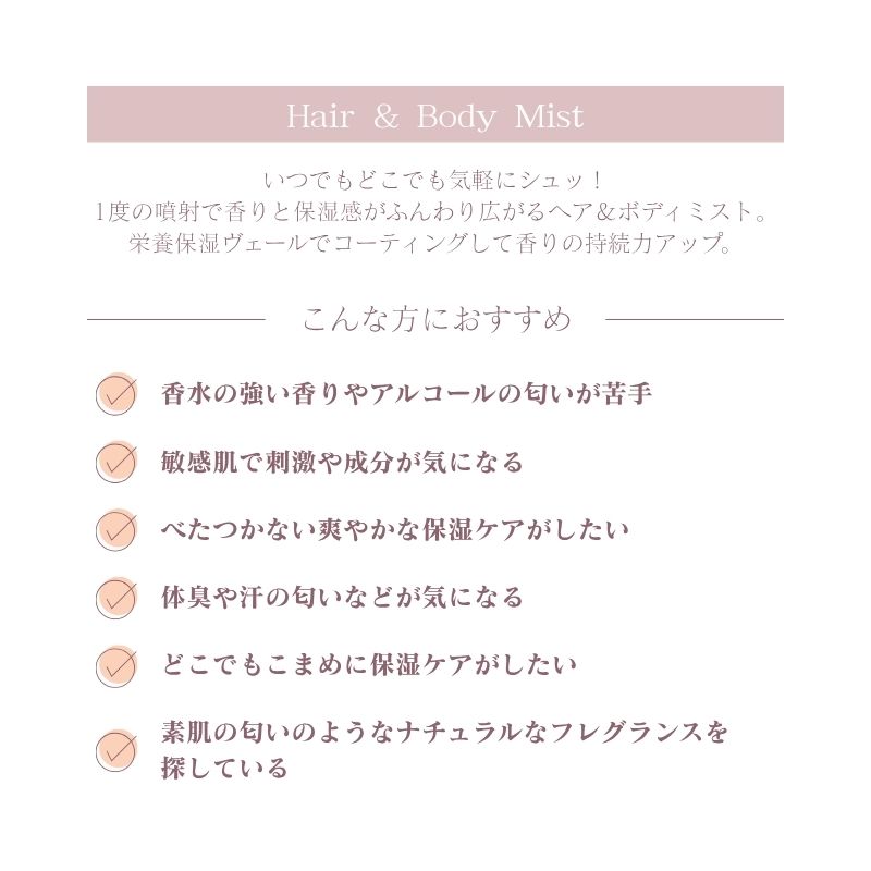 1度の噴射で香りと保湿感がふんわり広がるヘア&ボディミスト。栄養保湿ヴェールでコーティングして香りの持続力アップ。