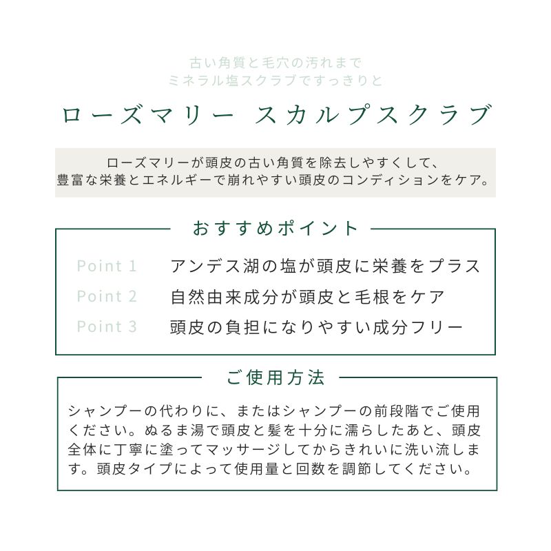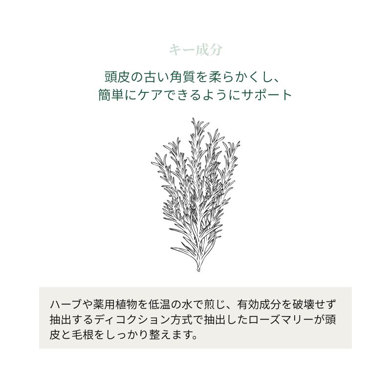 成分 海塩(アンデス湖の塩)、塩化Na(塩)、ローズマリー葉エキス(13.8%)、精製水、アカマツ葉エキス、ココイルメチルNa(ココナッツ由来の洗浄剤)、グリセリン(植物由来の保湿剤)、ココベタイン(ココナッツ由来の洗浄剤)、ラウリルベタイン(植物由来の保湿剤)、ショウガ根エキス、キサンタンガム(タンパク質発酵保湿 / 粘度調節剤)、プロパンジオール(植物由来の保湿剤)、エチルヘキシルグリセリン(柔軟剤)、ローズマリー葉油(4,630ppm)、メボウキ葉エキス、カミメボウキ葉エキス、ハナハッカ葉エキス、ビフィズス菌培養溶解質(発酵保湿剤)、乳酸桿菌培養溶解質(発酵保湿剤)、カフェイン(頭皮コンディショニング剤)、デクスパンテノール(抜け毛緩和機能性成分)、ワサビノキ種子油、メントール(頭皮清涼剤)、サリチル酸(抜け毛緩和機能性成分)、アトラスシーダー樹皮油、シベリアモミ油、イタリアイトスギ油、ナイアシンアミド(抜け毛緩和機能性成分)、カミツレ花エキス、クマツヅラエキス、アンソッコウエキス、DPG(保湿剤)、*リモネン(ローズマリーオイルに含まれる成分)、グアーヒドロキシプロピルトリモニウムクロリド(グアー豆由来の毛髪柔軟剤)、メリアアザジラクタ葉エキス、メリアアザジラクタ花エキス、コクシニアインディカ果実エキス、コハク、ナス果実エキス、ウコン根エキス、サンゴモエキス、EDTA-2Na(酸化防止剤)、1,2-ヘキサンジオール(柔軟剤)*エッセンシャルオイル本来に含まれる成分です。