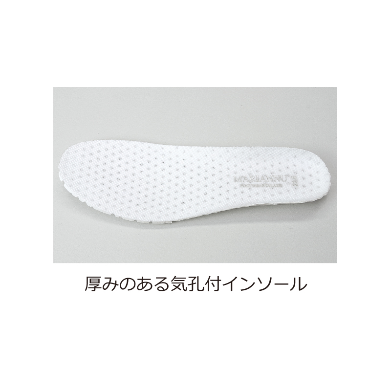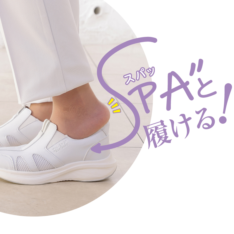●靴ベラ型のかかとはハンズフリー仕様で手を使わずに着脱可能●厚みのある気孔付インソールで通気性とクッション性を確保