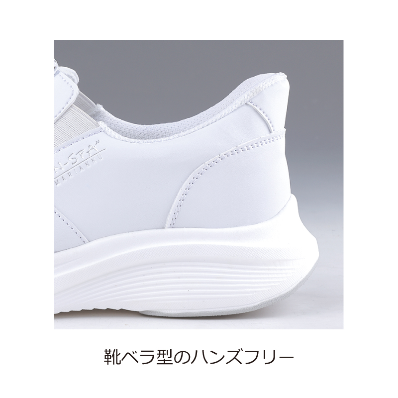 ●靴ベラ型のかかとはハンズフリー仕様で手を使わずに着脱可能●厚みのある気孔付インソールで通気性とクッション性を確保