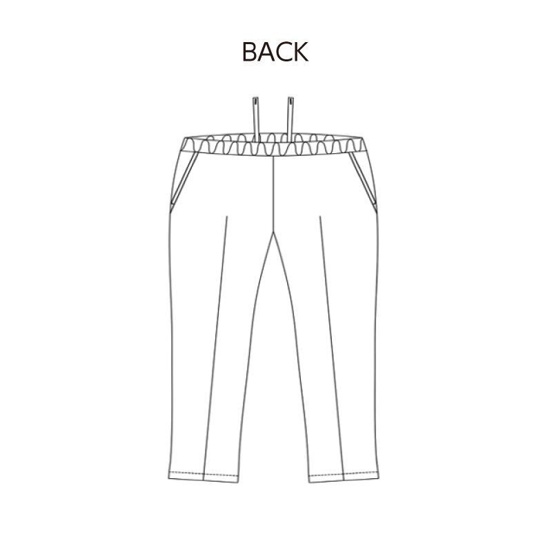 総ゴムウエスト(ひも入り)、両脇ポケット、裾上げ済