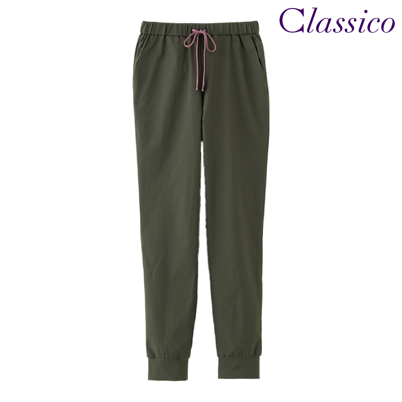 総ゴムウエスト(ひも入り)、両脇ポケット、右後ろポケット、裾リブ仕様