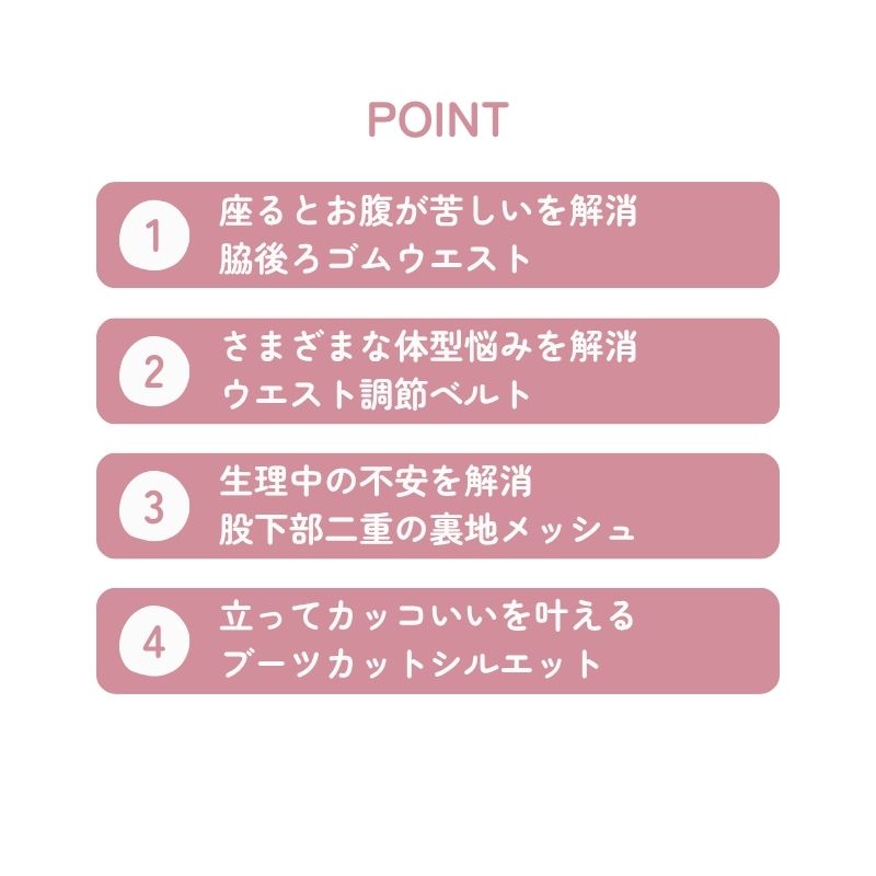 生理期間をはじめ体型が変化しやすい女性がいつでも快適に着用できるよう、工夫を凝らした美脚パンツ。