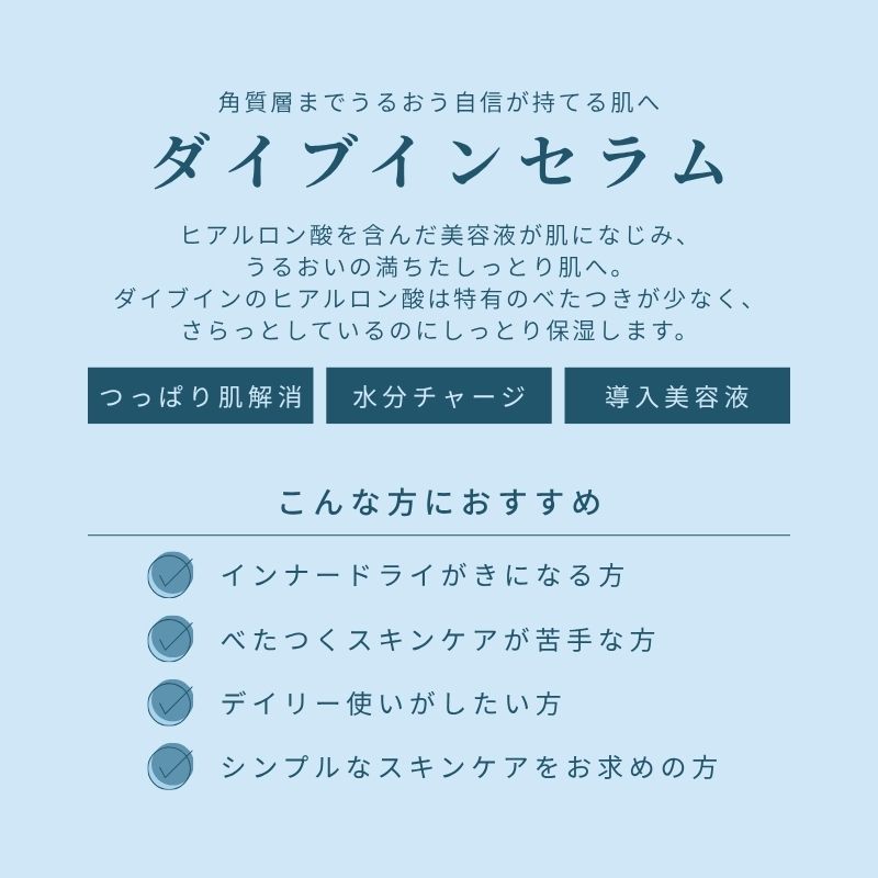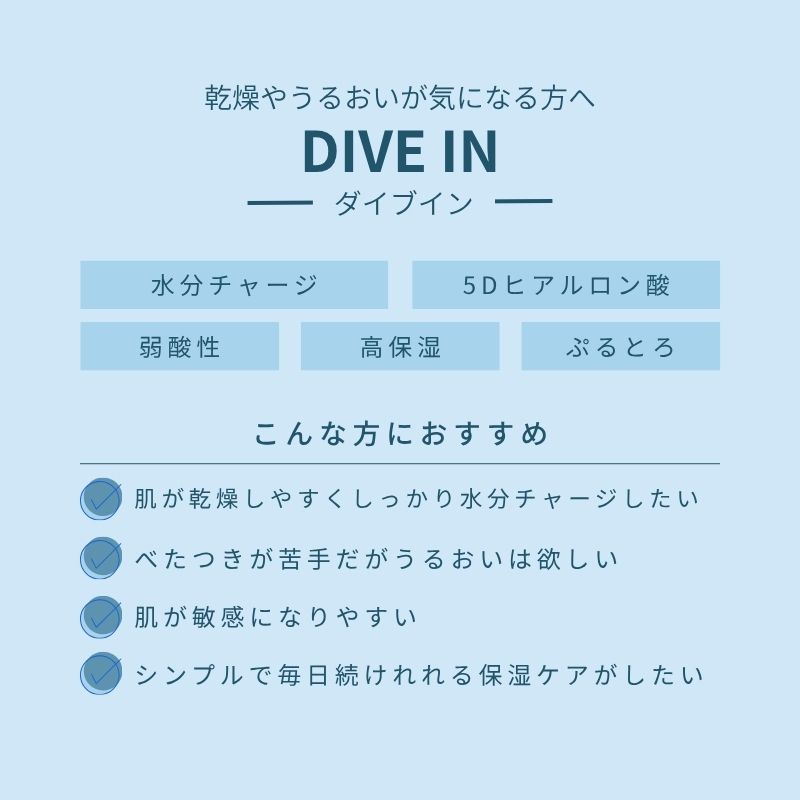ダイブインのヒアルロン酸は特有のべたつきが少なく、さらっとしているのにしっとり保湿します。
