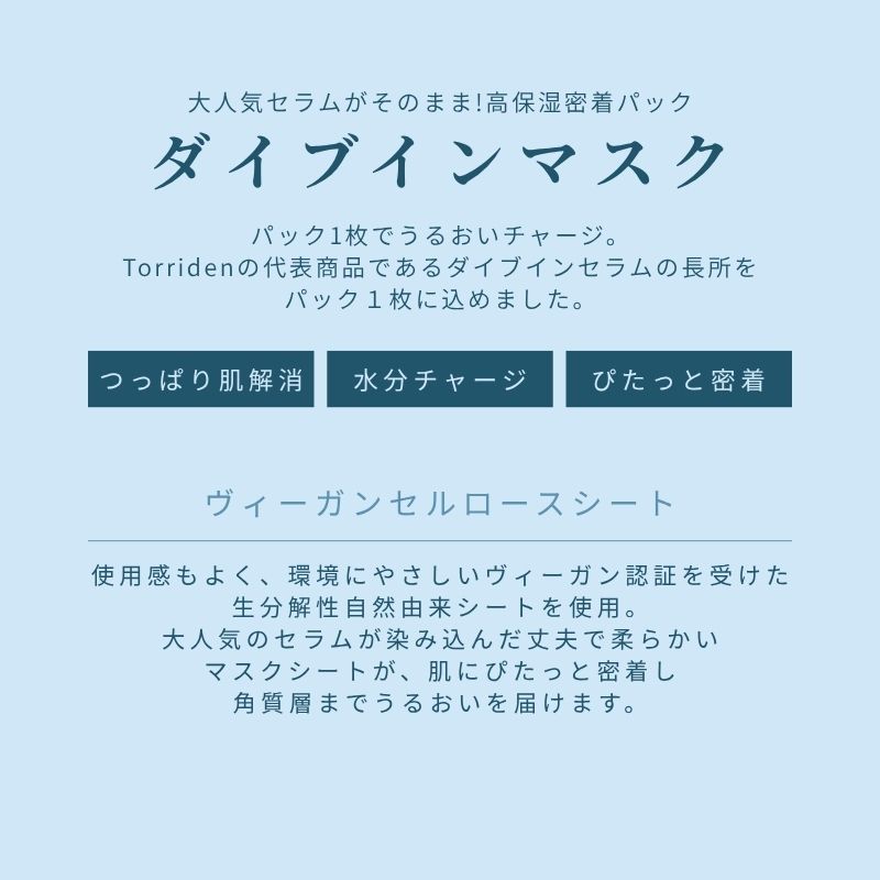 Torridenの代表商品であるダイブインセラムの長所をパック1枚に込めました。<5D 複合低分子ヒアルロン酸(保湿成分)>