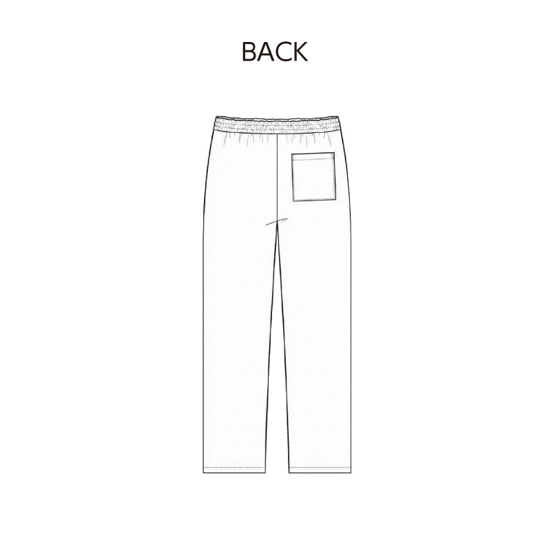 <ストレートパンツ>総ゴムウエスト(ひも入り)、両脇ポケット、右後ろポケット、裾上げ済、ヒップ部裏地付(ホワイトのみ)