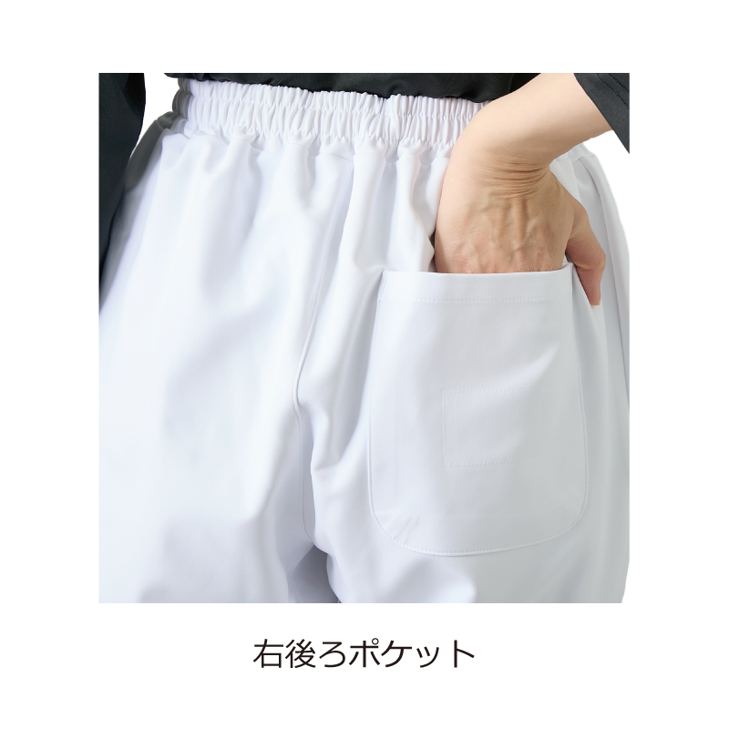 <ストレートパンツ>総ゴムウエスト(ひも入り)、両脇ポケット(左ピスネーム付)、右後ろポケット、裾上げ済
