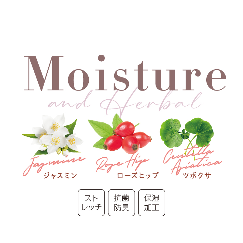ジャスミン、ローズヒップ、ツボクサ(シカ)を使用した保湿加工で、しっとりした肌触りを実現。