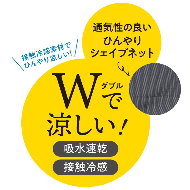通気性の良いひんやりシェイプネットを腰と足の付け根付近に使用し、生地全体は接触冷感で1日中ひんやり涼しく、気持ちのよい着心地です。またお腹・骨盤・ヒップを優しく整える仕様です。