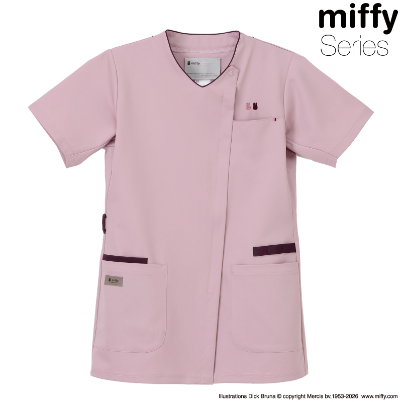 シンプルデザインもさりげないミッフィーモチーフがアクセントに。<br>フロントファスナー、3連ループ付きと小技が効いていて機能的なスクラブです。<br><br>前ファスナー、左胸ポケット、両脇ポケット(右ダブルポケット)、<br>右ウエストループ、左脇三連ループ、後ろ襟吊り付き