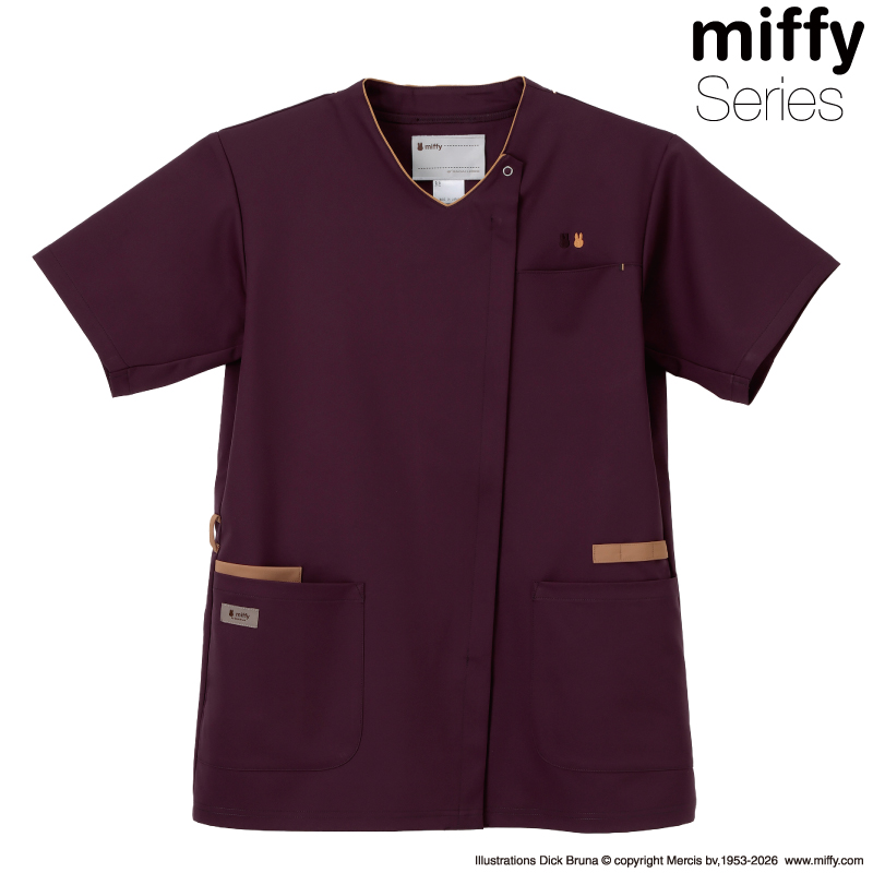 シンプルデザインもさりげないミッフィーモチーフがアクセントに。<br>フロントファスナー、3連ループ付きと小技が効いていて機能的なスクラブです。<br><br>前ファスナー、左胸ポケット、両脇ポケット(右ダブルポケット)、<br>右ウエストループ、左脇三連ループ、後ろ襟吊り付き| サイズ | 胸囲(cm) | 肩幅(cm) | 袖丈(cm) | 着丈(cm) |