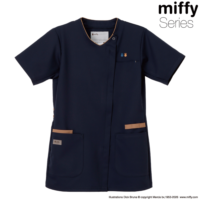 シンプルデザインもさりげないミッフィーモチーフがアクセントに。<br>フロントファスナー、3連ループ付きと小技が効いていて機能的なスクラブです。<br><br>前ファスナー、左胸ポケット、両脇ポケット(右ダブルポケット)、<br>右ウエストループ、左脇三連ループ、後ろ襟吊り付き| サイズ | 胸囲(cm) | 肩幅(cm) | 袖丈(cm) | 着丈(cm) |