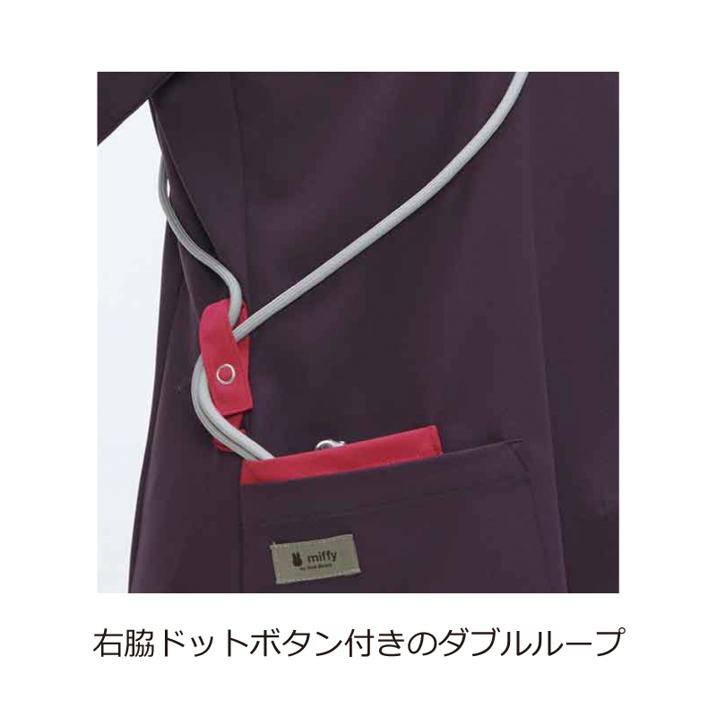 かわいさと機能性を兼ね備えたミッフィーの男女兼用スクラブ。<br><br>前ファスナー、左胸ポケット、両脇ポケット(右ダブルポケット)、<br>右脇ダブルループ、後ろサイドベンツ、後ろ襟吊り付き| サイズ | 胸囲(cm) | 肩幅(cm) | 袖丈(cm) | 着丈(cm) |