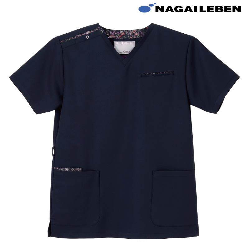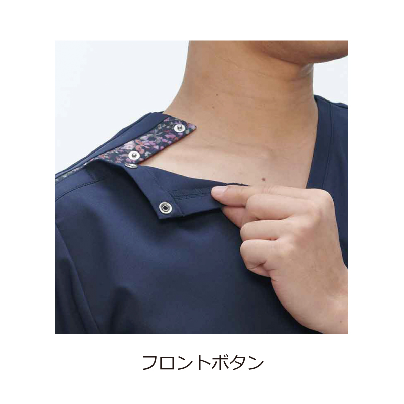 繊細な小花柄が代表的なリバティ社のテキスタイル。<br>その小花プリント柄を部分的に使った男女兼用スクラブ。<br><br>右肩スナップボタン、左胸ポケット、両脇ポケット(右ダブルポケット)、<br>両脇スリット、右脇ループ!-- ///// START サイズ表 ///// -->| サイズ | 胸囲(cm) | 肩幅(cm) | 袖丈(cm) | 着丈(cm) |
