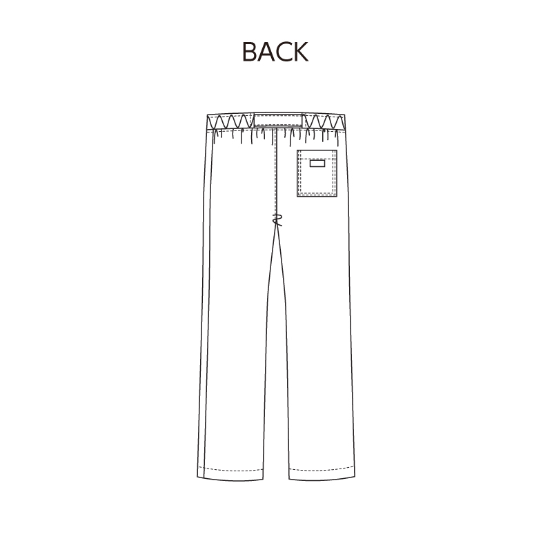 総ゴムウエスト(ひも入り)、両脇ポケット、右後ろポケット、裾上げ済