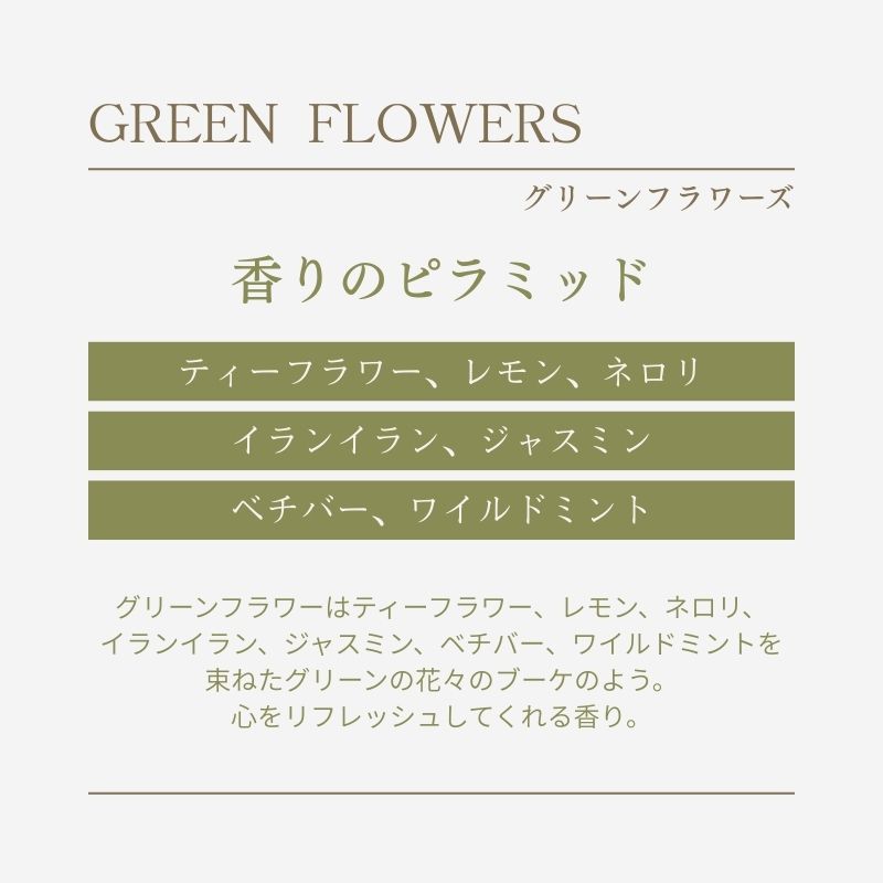 グリーンフラワーはティーフラワー、レモン、ネロリ、イランイラン、ジャスミン、