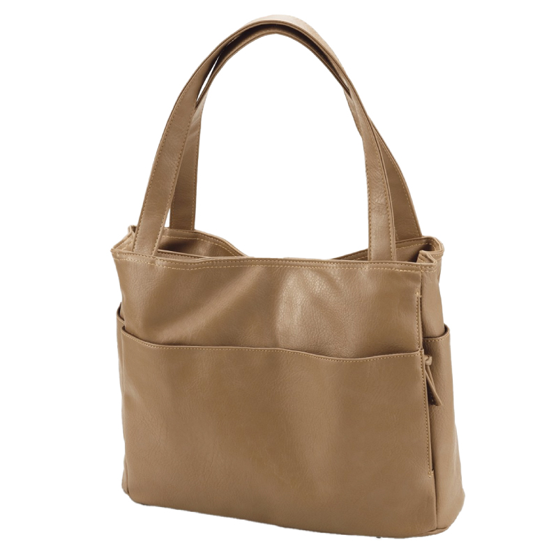 大事な財布や貴重品を入れるファスナー開閉、すぐ取り出したいものを入れるマグネット開閉と使い分けできる2室構造が特徴。やわらかで持ちやすい合成皮革素材の10ポケット付きトート