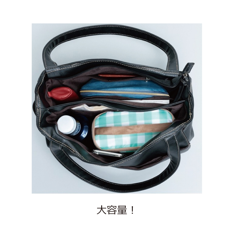大事な財布や貴重品を入れるファスナー開閉、すぐ取り出したいものを入れるマグネット開閉と使い分けできる2室構造が特徴。