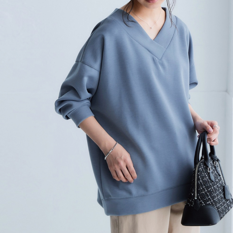 なめらかポンチ素材 前後Vネックプルオーバー グレイッシュブルー L