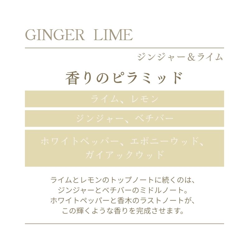 ライムとレモンのフレッシュなトップノートにスパイシーで活力を与えるジンジャーと