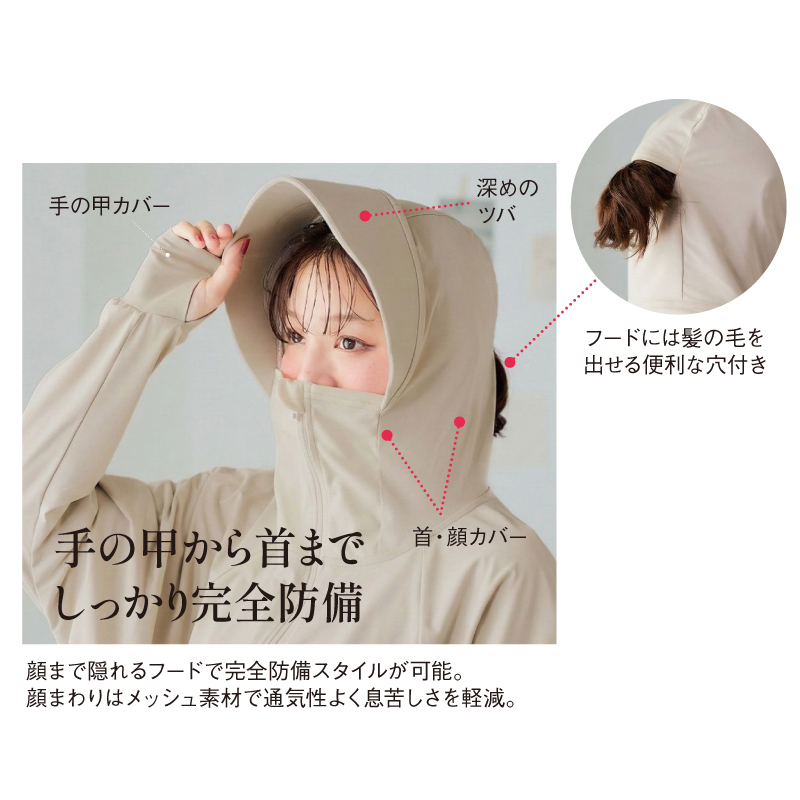 強い日差しの季節も、深めのつば付きフードと指穴設計で手の甲までしっかりガード。自転車やアウトドア、毎日の買い物まで頼れる一着です。