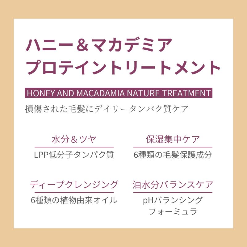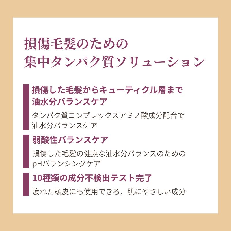 | 成分 | 水、セテアリルアルコール、ステアリルアルコール、ジメチコン、ベヘントリモニウムクロリド、シクロペンタシロキサン、PG、アモジメチコン、アルコール、酢酸トコフェロール、ダイマージリノール酸ダイマージリノレイル、ヒドロキシアセトフェノン、DPG、トリ(カプリル酸/カプリン酸)グリセリル、トレハロース、ステアリルトリモニウムクロリド、カプリリルグリコール、(C12-14)s-パレス-7、マカデミア種子エキス、ハチミツエキス、ベタイン、EDTA-2Na、シクロメチコン、トリデセス-10、BG、アラキジルアルコール、パンテノール、1,2-ヘキサンジオール、セタノール、クエン酸、ブラシカアミドプロピルジメチルアミン、グリチルリチン酸2K、トウキンセンカ花油、ヤシ油、アボカド油、アグガニアスピノサ核油、シア脂、アンズ核油、スクレロカリアビレア種子油、シルクアミノ酸、シクロヘキサシロキサン、加水分解ダイズタンパク、加水分解コラーゲン、加水分解ケラチン、加水分解シルク、グリセリン、ツルドクダミ根エキス、オニノダケ根エキス、ウスバサイシン根エキス、スベリヒユエキス、コノテガシワ葉エキス、クコ果実エキス、クララ根エキス、ハス花エキス、ヤマザクラ花エキス、セージエキス、ツバキ花エキス、プロポリスエキス、ショウブ根エキス、アセロラ果実エキス、アサイヤシ果実エキス、リンゴ果実エキス、プルヌスセロチナ果実エキス、モモ果実エキス、バオバブ種子エキス、ワサビノキ種子エキス、マコンブエキス、ベニバナ花エキス、イチョウ葉エキス、ヒアルロン酸Na、イナゴマメ果実エキス、ツバキ葉エキス、カキ果実エキス、香料 | 参考販売価格 | 1,650円(税込) |