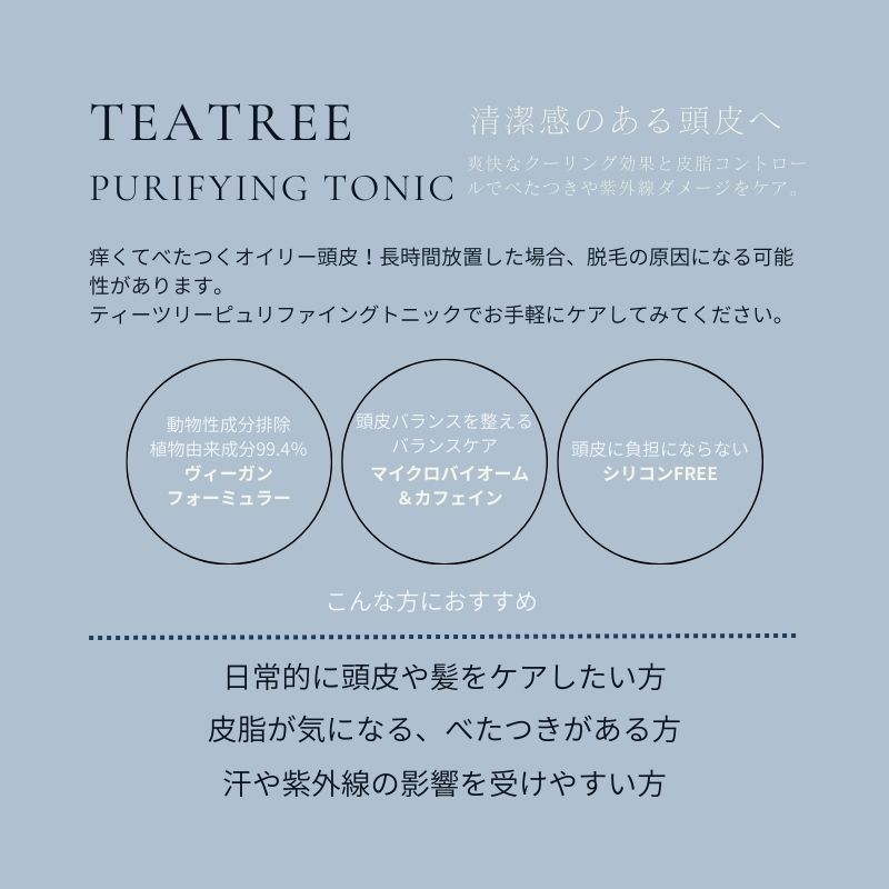 | 成分 | アルコール、ティーツリー葉エキス(25.3%)、ハッカエキス、精製水、セイヨウハッカ油、ティーツリー葉油(2,000ppm)、パンテノール、サリチル酸、ビフィズス菌培養溶解質、乳酸桿菌培養溶解質、ヤナギハッカエキス、コロハ種子エキス、メントール、ゴボウ根エキス 、レモン果皮油、ユーカリ葉油、アトラスシーダー樹皮油、カフェイン、ショウガ根エキス、ショウガ根油、グリセリン、チアミンHCI、ピリドキシンHCI、アスコルビン酸、ビオチン、メナジオン、リボフラビン、1,2-ヘキサンジオール、ベンジルグリコール、エチルヘキシルグリセリン、*リモネン、*シトラール、*リナロール *エッセンシャルオイル本来に含まれる成分です。 | 参考販売価格 | 2,300(税込) |