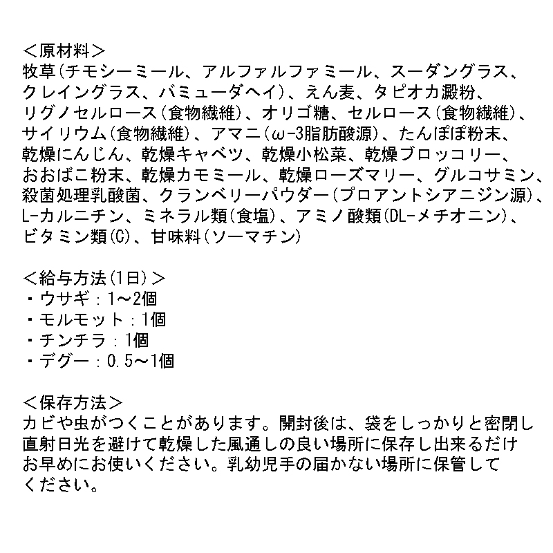 消化器・泌尿器・皮膚被毛ケアなどをトータルケア。牧草50%&自然素材配合でヘルシーにおいしく食べられるよう考えられています。