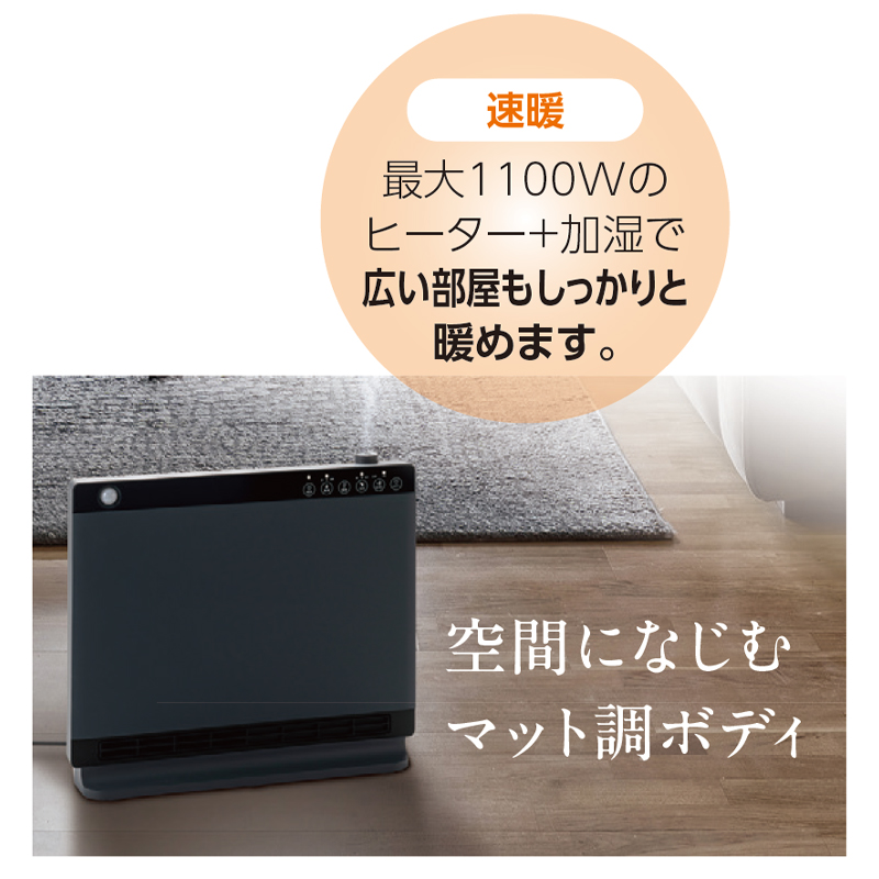 最大1100Wのヒーター+加湿で広い部屋もしっかりと暖めます。電源:AC100V 50/60Hz