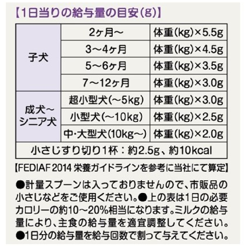 | 成分 | 421kcal/100g 乳類(カゼイン、脱脂粉乳、乳清たんぱく、乳清たんぱく分解物)、でん粉分解物、油脂類(動物性油脂、植物性油脂)、難消化性デキストリン(水溶性食物繊維)、ブドウ糖、乳糖、DHA粉末、動物用ビフィズス生菌、ミルクオリゴ糖、乾燥酵母、キトサン、ミネラル類(Ca、P、K、Na、Cl、Mg、Fe、Cu、Mn、Zn、I)、ビタミン類(A、D、E、B1、B2、B6、B12、C、ナイアシン、パントテン酸、ビオチン、葉酸、イノシトール、コリン、L-カルニチン、β-カロテン)、コンドロイチン、pH調整剤、グルコサミン、乳化剤、アミノ酸類(L-アルギニン、L-シスチン、DL-メチオニン)、香料、ヌクレオチド |
