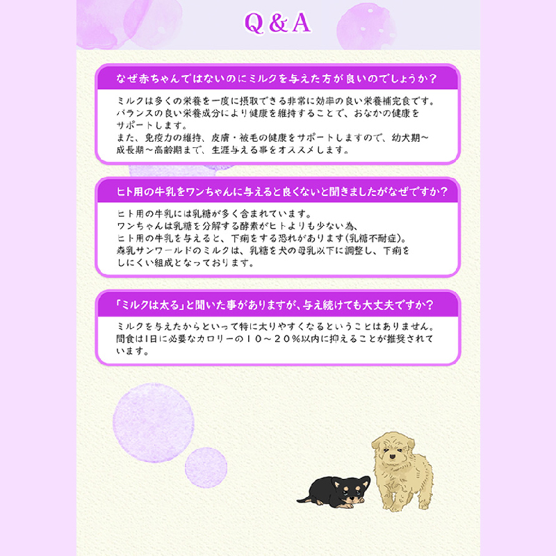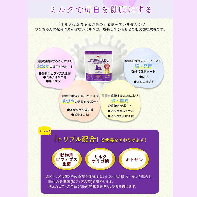 1.生後2ヶ月~シニア期の健康をサポートするために特別に調整されたミルクです。2.吟味された原材料と機能性素材を用いており、生後2ヶ月~シニア期の必要な成分を補い健康を維持し美しい被毛をサポートします。