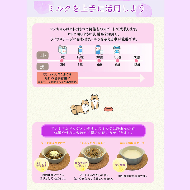 生後2ヶ月からシニア期まで生涯与え続けられる栄養補完食のミルクです。