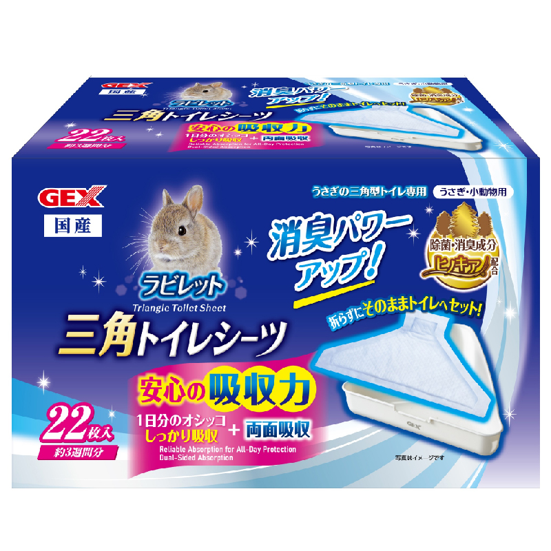 うさぎなど小動物の三角型トイレに適したトイレシーツです。(※ジェックス製うさぎの三角型トイレ推奨)オシッコをたっぷり吸収でニオイも軽減、頼れる吸収力!