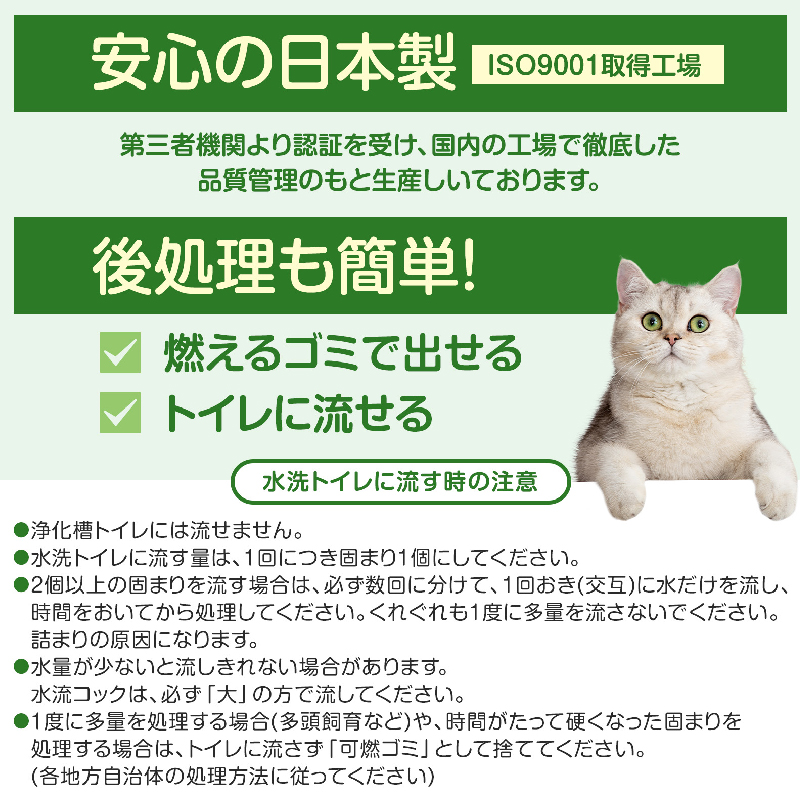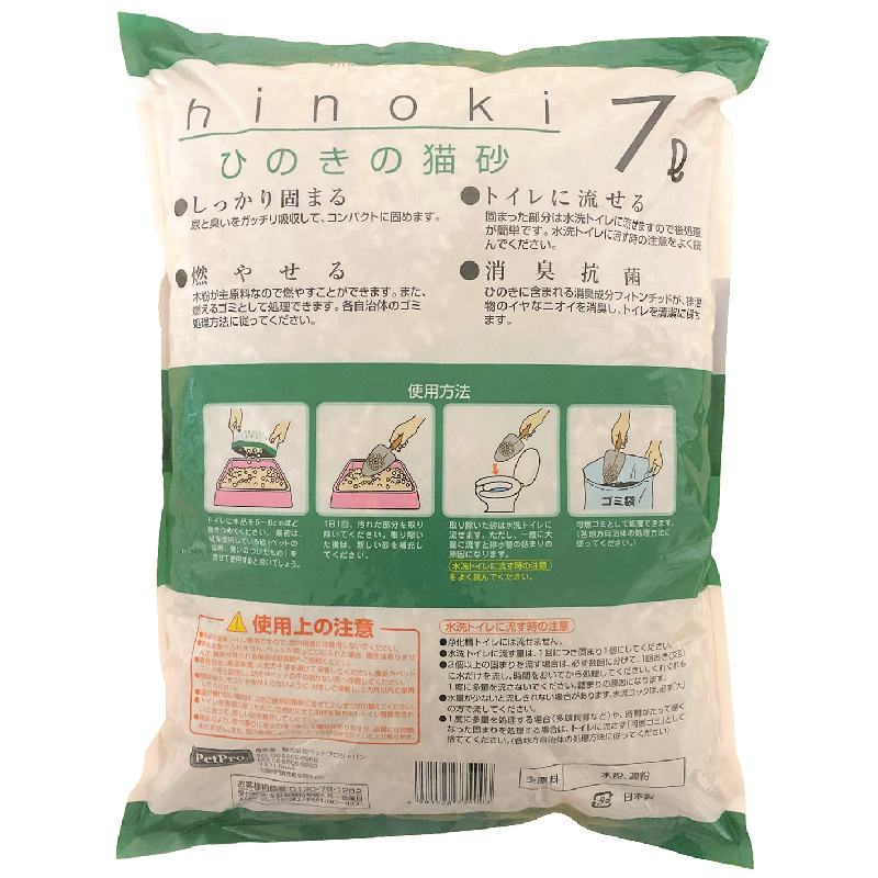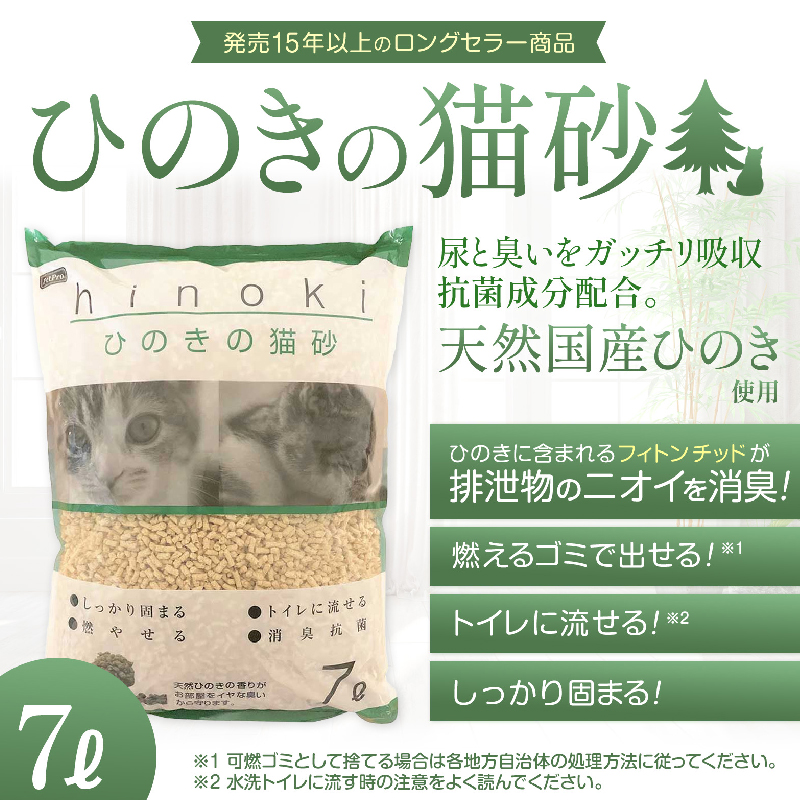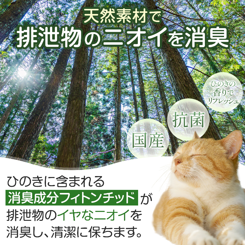 木粉が主原料なので燃やすことができ、燃えるゴミとして処理することができます。ひのきに含まれる消臭成分フィトンチッド(樹木が放出する揮発成分)が排泄物のイヤなニオイを消臭&清潔に保ちます。