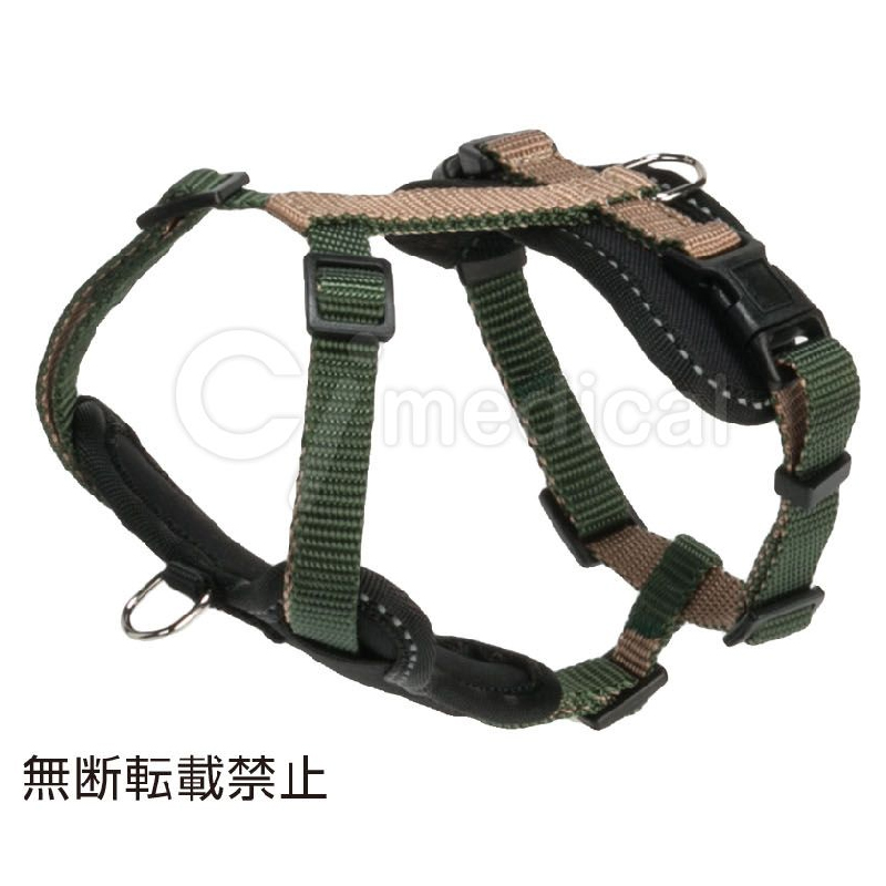 原着ポリエステルを使用しているため、ソフトな仕上りで犬にも優しい素材です。前側Dカンは、前へ引っ張ると、自然に横へ力が加わり、引っ張り抑制に。