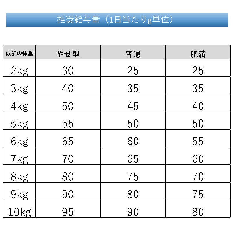 | 成分 | (100gあたり)粗タンパク質 31%以上、粗繊維 7%以下、水分 8%以下、粗脂肪 17%以上、粗灰分 10%以下、エネルギー392kcal |