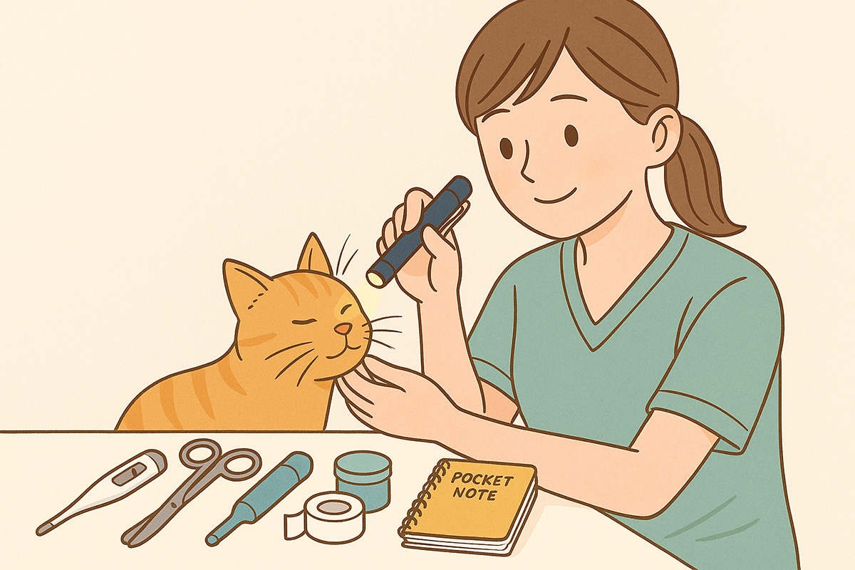 診療では動物がじっとしてくれる時間が限られます。ペンライトは粘膜や瞳孔反射を即座にチェックでき、体温計は早期の異常察知に不可欠。メディカルはさみは包帯・チューブ・パッケージを安全にカットし、アルコール綿&テープはその場での固定や消毒に活躍。最後のポケットノートは観察メモを即時に残せるため、情報の取りこぼし防止とチーム共有に役立ちます。